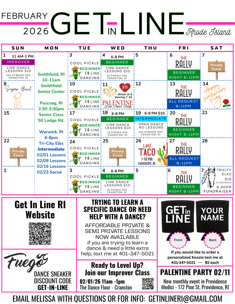 This is your chance to learn some intermediate line dances. The ones that are difficult to just pick up on the floor. Lessons for each week will be posted in the facebook event on the Get in Line RI Line Dancing Facebook page. There will be 2 New Lessons and 2 Quick Reviews each week – Quick reviews are designed to refresh our memories and work out any issues we maybe having with the dances.